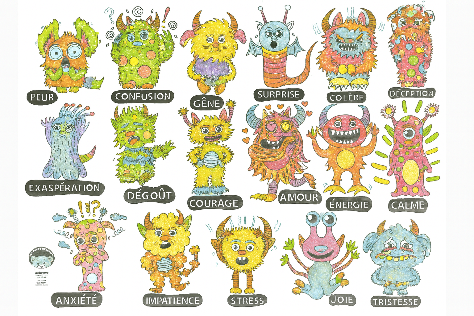 Chaque monstre incarne une émotion précise, identifiée sous son illustration en français et en anglais — une valeur éducative unique qui aide les enfants à reconnaître, nommer et comprendre leurs émotions tout en s’amusant.